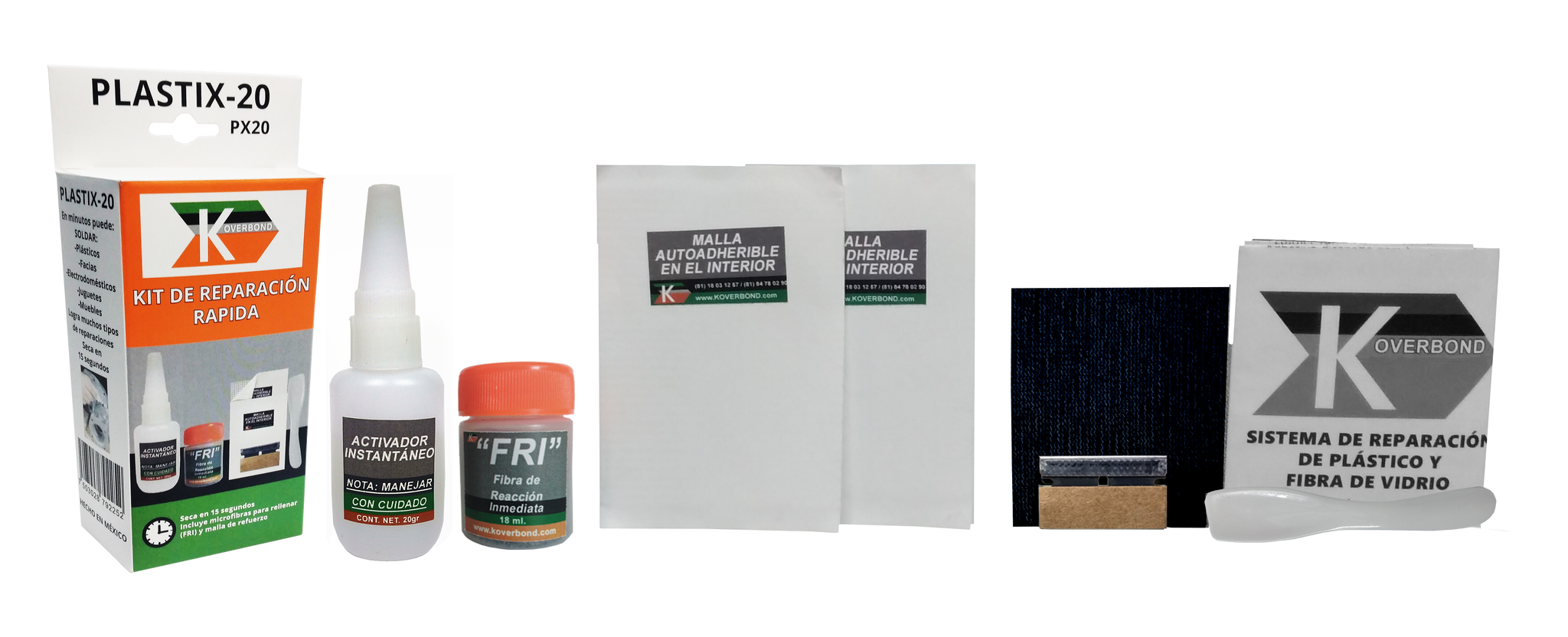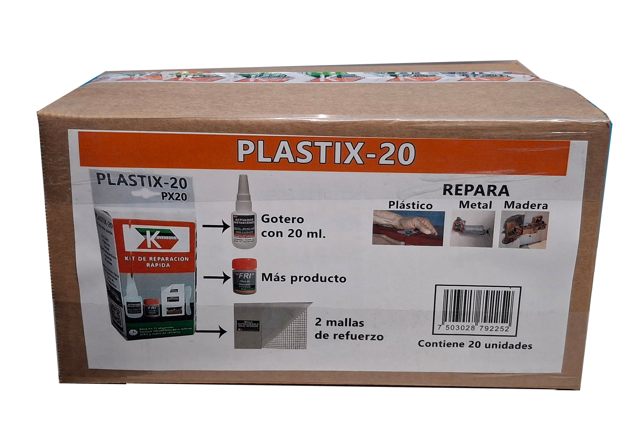 PLASTIX-20 es un kit de adhesivo instantáneo para reparaciones rápidas. Logra una soldadura química instantánea en la mayoría de los plásticos, metales, así como hule, madera e inclusive vidrio. Funciona como soldadura de punto o como un adhesivo estructural para pegar sujetadores, grapas, porta grapas, cejas y/o soportes de faro. Puede ser lijado, desbastado, taladrado, torneado y pintado. Está compuesto de 3 elementos principales: (1) Un activador instantáneo (gotero), (2) "FRI" una Fibra de Reacción Inmediata y (3) una malla auto adherible de refuerzo. La combinación de estos elementos logra una variedad de soluciones rápidas y simples a varios de los problemas que se encuentran en industrias como enderezado y pintura, mecánica automotriz, reparación de electrodomésticos, soldadura de polímeros y soldadura de aluminio.